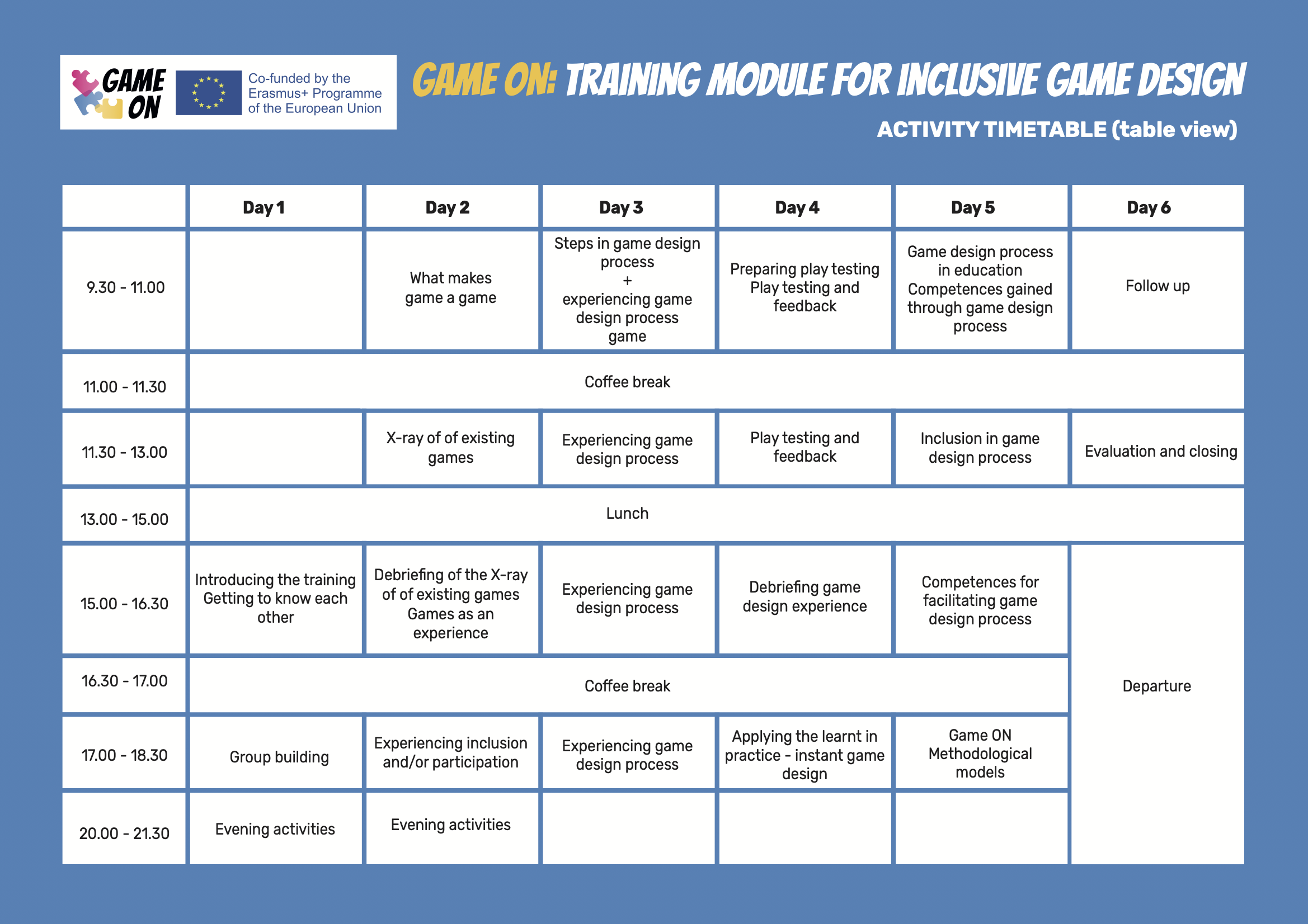 The training was divided into several parts, starting with preparation and ending with reflection. We introduced participants to the game design process, followed by a day of group work on creating game prototypes and playtesting with feedback. The following two days were dedicated to conceptualization and experimentation, including sessions on the educational benefits of game design and the competences needed to facilitate the process.