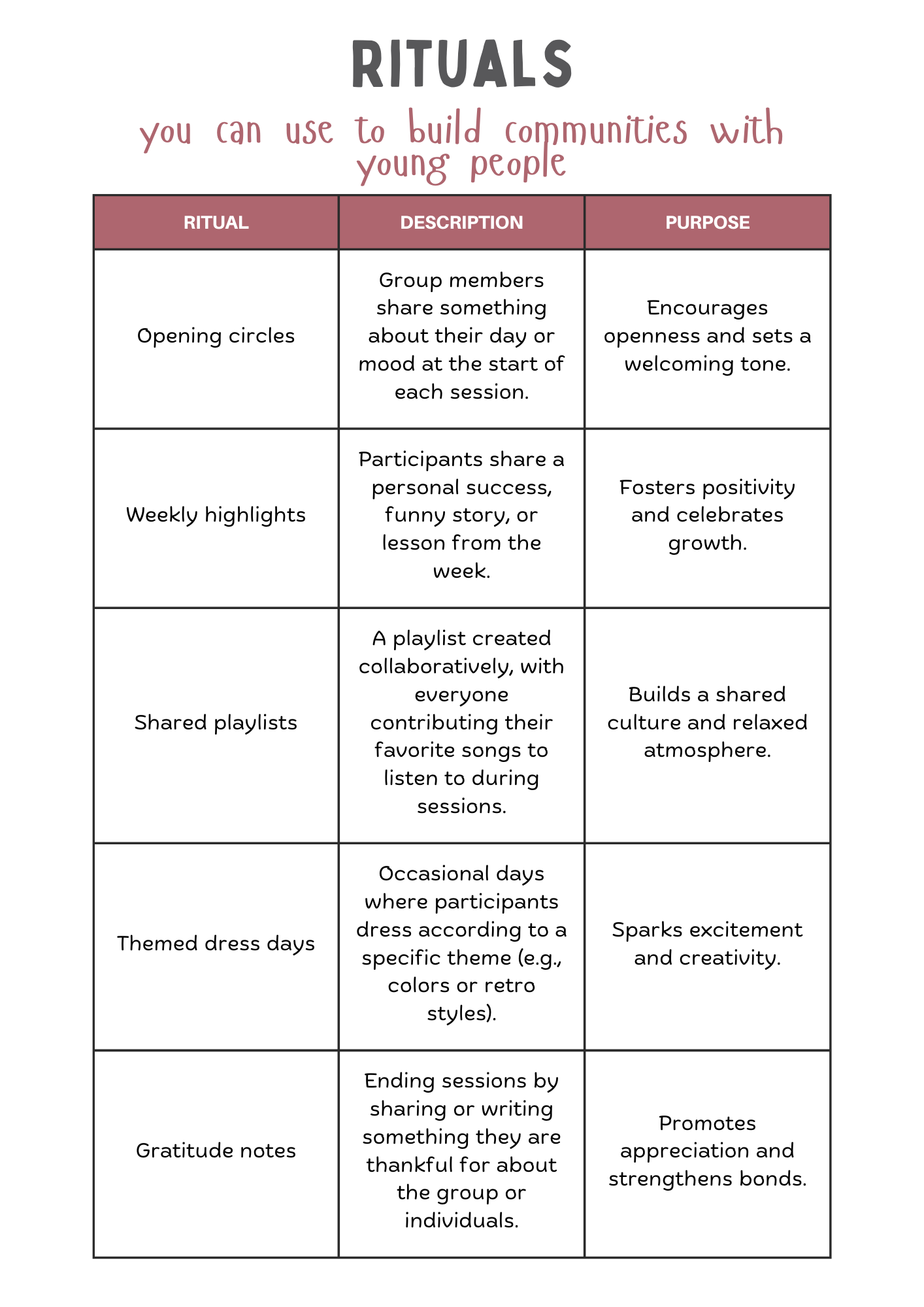 Identify values, roles, and ways to connect. Shared goals, activities, and even small traditions create belonging and energy.