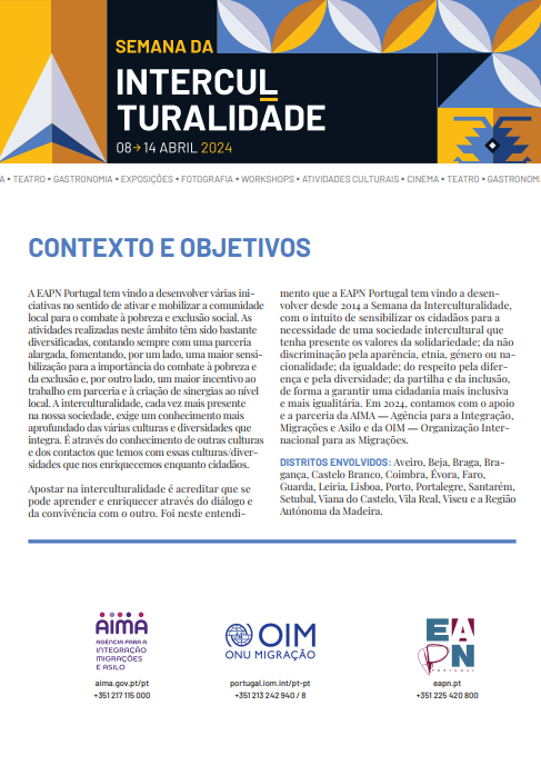 A "Semana da Interculturalidade" é uma iniciativa promovida pelo Núcleo Distrital de Lisboa - EAPN Portugal com o apoio da OIM e da AIMA.