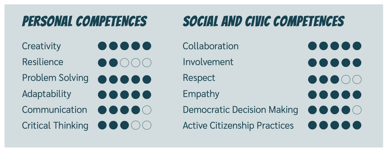 Priklausomai nuo konkretaus žaidimų kūrimo modelio (sužinok daugiau apie modelius grojaraštyje “Game design models”), įsitraukę žmonės gali tobulintis žemiau pateiktus gebėjimus.