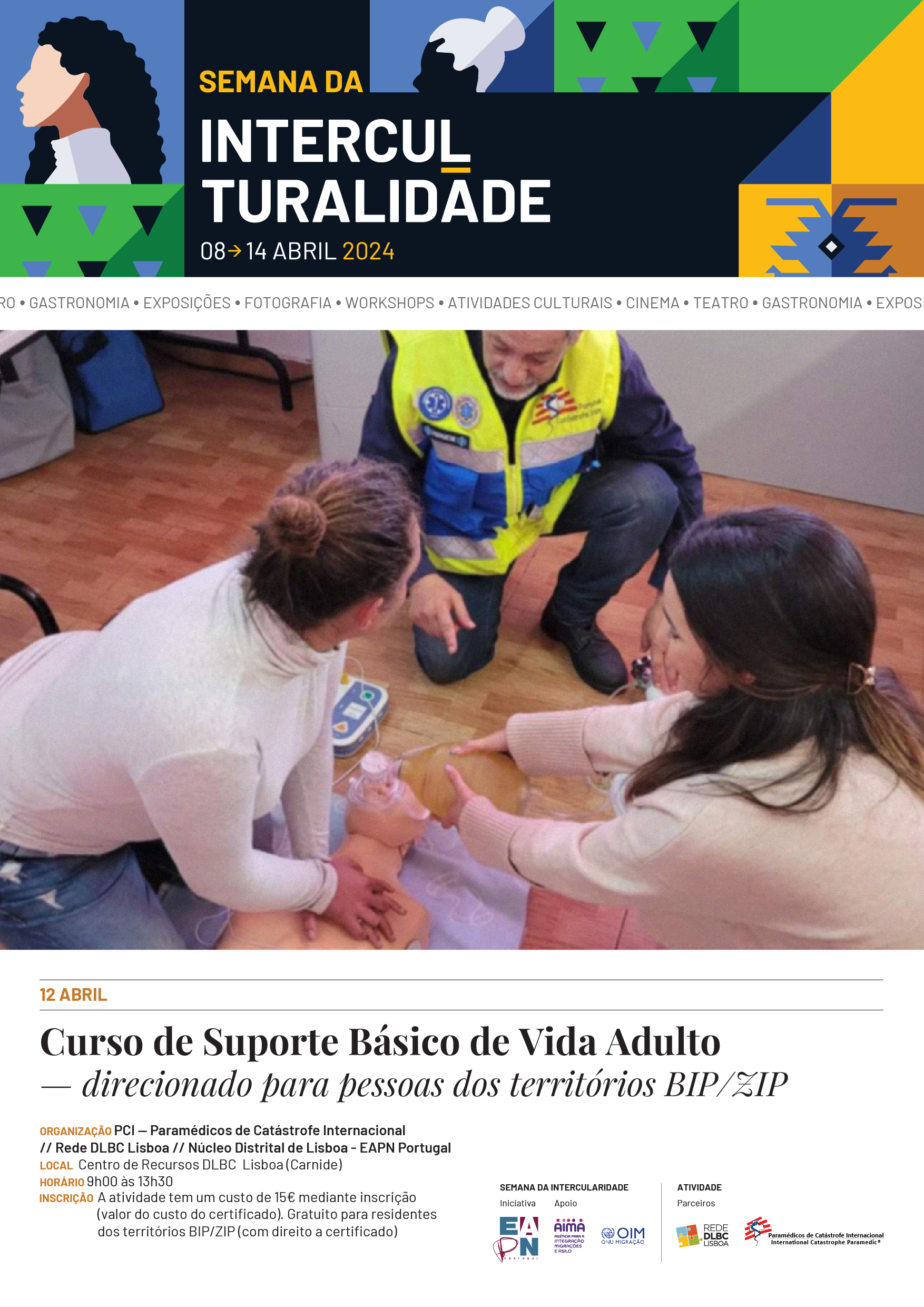 No âmbito da Semana da Interculturalidade, a Rede DLBC Lisboa está a organizar uma atividade em parceria com os Paramédicos de Catástrofe Internacional, um curso em SBV-A - Suporte Básico de Vida no Adulto, certificado pela DGERT, limitado a 20 participantes.